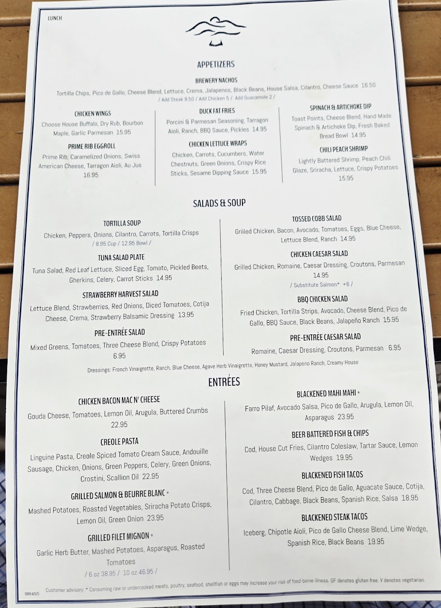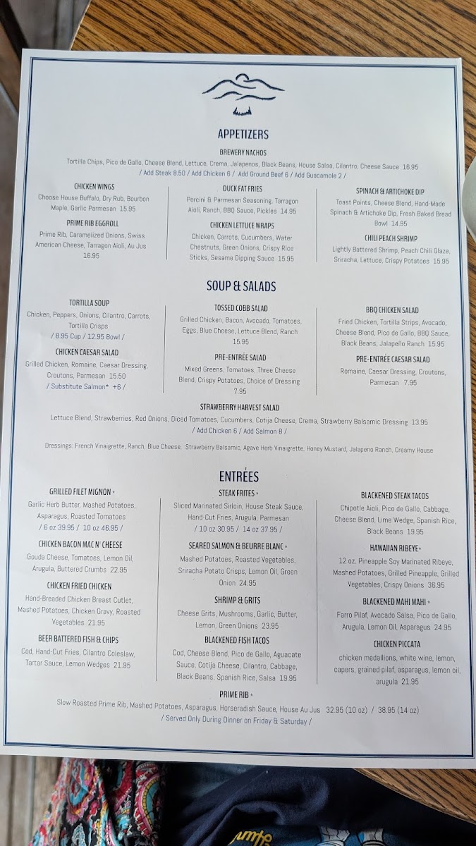 Guests often gather here for both lunch and dinner, whether settling in for comfort food like Beer Battered Fish & Chips or sharing a round of Brewery Nachos with friends. The variety covers everything from satisfying sandwiches and creative pizzas to standout entrees such as Shrimp & Grits and the popular Hawaiian Ribeye. Meanwhile, those seeking lighter options can choose from fresh side salads or classic appetizers like Spinach & Artichoke Dip and Bavarian Pretzels.